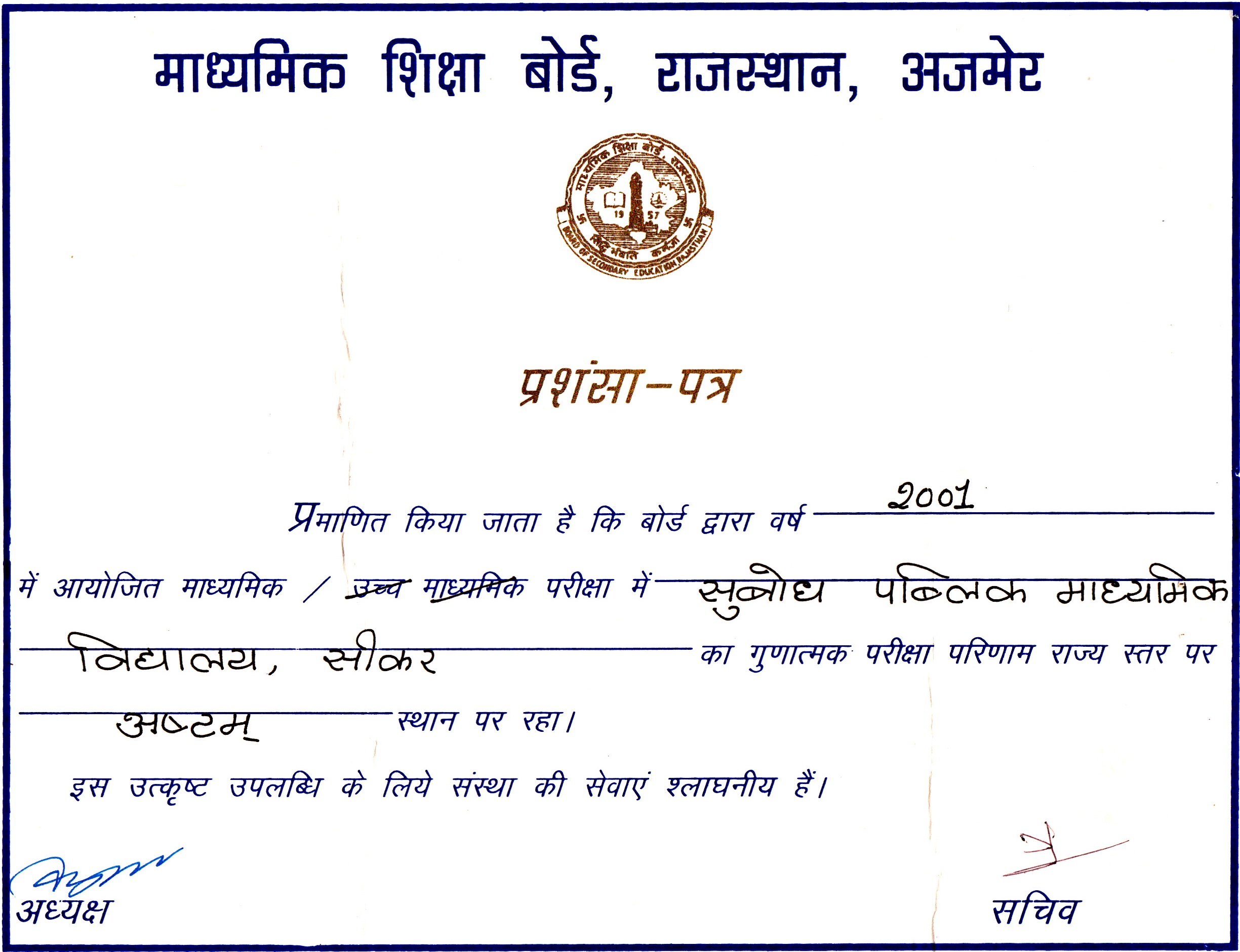 Last 5 years of continues Merit position of students in Board of Secondary education, Rajasthan (Secondary and Senior Secondary) and best discipline practices of school and hard work of experienced and dedicated Staff members. Securing first position and getting into Merit list by many of our students In Board of Secondary education Secondary and Senior Secondary examination is a proof of our best education practices.